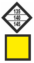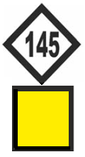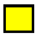 Cuadrada; fondo amarillo; franjas e inscripciones en color negro